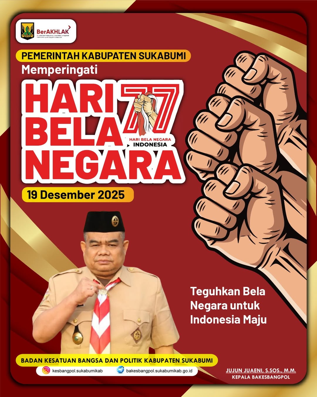 Badan Kesatuan Bangsa dan Politik Kabupaten Sukabumi mengucapkan Selamat Memperingati Hari Bela Negara ke-77 19 Desember 2025.