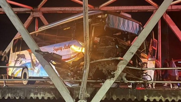 “Dari hasil olah tempat kejadian perkara, bus diduga kurang menjaga jarak aman dengan kendaraan di depannya sehingga pengemudi kehilangan kendali dan akhirnya menabrak besi pembatas jembatan,” ujar Rudi saat dikonfirmasi.