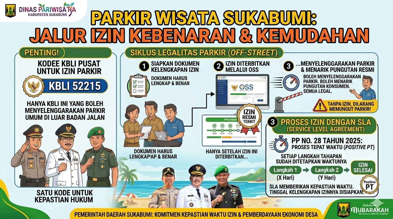 SUKABUMI — Pemerintah Kabupaten Sukabumi resmi mewajibkan seluruh pengelola fasilitas parkir di kawasan wisata untuk mengantongi izin resmi. Kebijakan tersebut tertuang dalam Surat Edaran Bupati Nomor 400.14.1.1/3545/Dispar/2026.